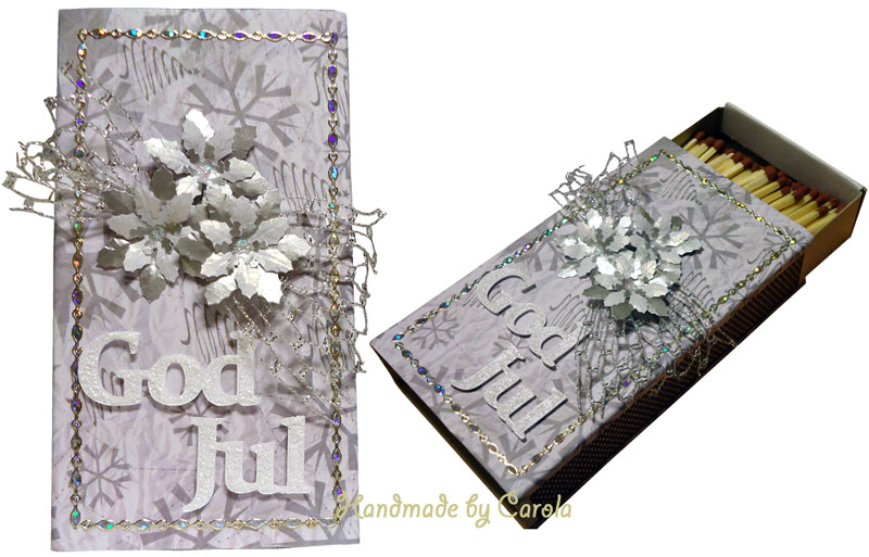 Deze luciferdoos heb ik beplakt met papier uit een kerstblokje van de Action. De matzilveren en witte bloemetjes zijn gemaakt met de floral punch poinsettia (Nellie Snellen). De tekst "God Jul" heb ik gesneden met de Silhouette en bewerkt met stickles "frosted lace". De stickerrand is van Doodey.